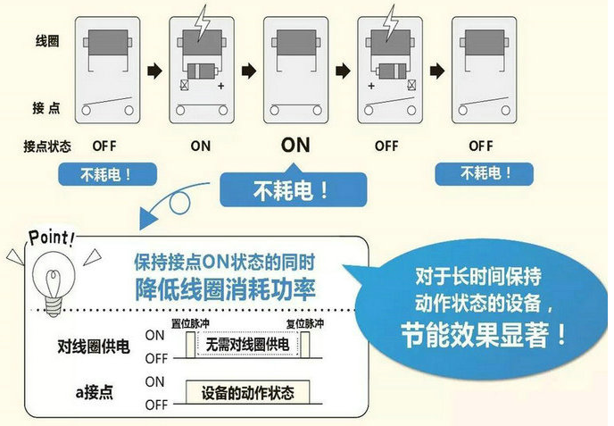 鎖定功能:在施加線圈電壓時將接點置ON或OFF即使斷開線圈電壓依然保持該狀態(tài)的功能。在設備的動作狀態(tài)下降低線圈消耗功率,為節(jié)能作出貢獻。