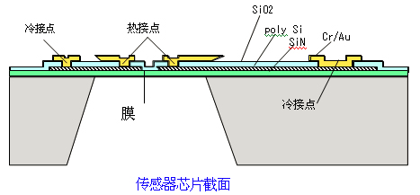 利用賽貝克效應(yīng)(2種不同金屬接點間的溫度差而產(chǎn)生的溫差電動勢)。使用n型Poly Si、p型Poly Si作為材料進行熱電對接形成熱電堆。在熱絕緣性良好的介電薄膜上加載熱接點,在熱傳導(dǎo)性良好的硅材料上加載冷接點,通過高速對應(yīng)實現(xiàn)高功率的能量轉(zhuǎn)換(紅外線—溫度--溫差電動勢)。