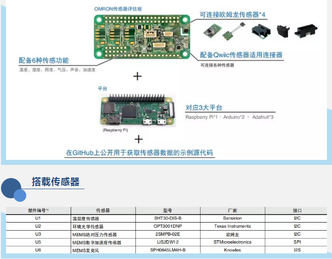 歐姆龍電子部件作為一家在傳感器領域有著先進技術的高科技公司發布了傳感器評估板——2JCIE-EV,展示了歐姆龍領先于世界的高新技術在傳感器領域的應用,幫助設計人員和工程師快速評估和開發測試。同時該評估板支持接入三大開放性平臺(Raspberry Pi*1、Arduino*2、Adafruit*3)并且適用于多種類型傳感器的評估。