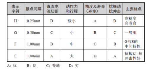 不同的接點間隔,開關行程的移動差(即MD:從驅動桿的動作位置到復位位置的移動距離或者移動角度)、靈敏度、壽命、直流電流切斷、抗沖擊、抗振動的能力都不同。