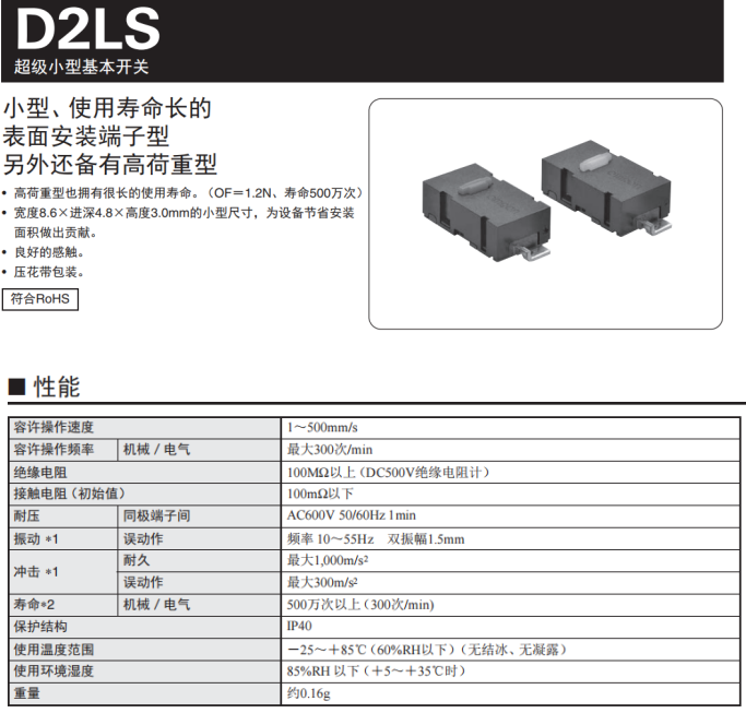 歐姆龍D2LS系列開關,高荷重型也擁有達到500萬次的電氣壽命,超級小型身材,寬度8.6*進深4.8*3.0mm尺寸,為設備節(jié)省安裝面積,觸感良好,容許操作速度1~500mm/s,操作頻率最大300次/min,重量僅有0.16g。