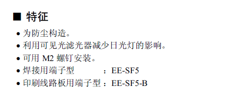 EE-SF5 微型光電傳感器[反射型] 為防塵構(gòu)造。 利用可見(jiàn)光濾光器減少日光燈的影響。 可用M3 螺釘安裝。 焊接用端子型:EE-SF5 印刷線路板用端子型:EE-SF5-B