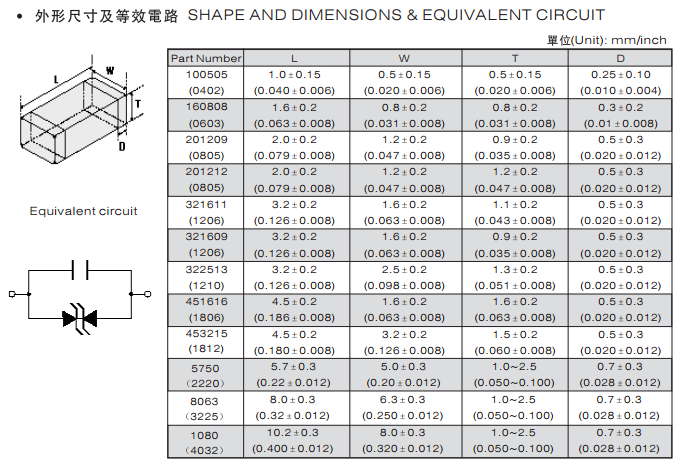 特征: 1、疊層片式陶瓷結(jié)構(gòu)。 2、無引線。 3、溫度范圍:-55℃~+125 ℃。 4、工作電壓范圍V w(dc)=3.3~ 615V。 5、具有雙向限制特性,適合ESD保護(hù)。 6、漏電流非常小。 7、寄生電感小、響應(yīng)速度快(響應(yīng)時間少于0.5ns)。 8、優(yōu)良的溫度系數(shù)。 9、良好的焊接性能(端電極為三層電鍍)。 應(yīng)用: 1、防止過電壓:當(dāng)施加的電壓升高到壓敏電壓時,壓敏電阻器的電流急劇上升,被保護(hù)設(shè)備的浪涌電壓迅速減小,從而使裝有壓敏電阻器的設(shè)備抗浪涌噪聲能力達(dá)到相應(yīng)要求。
